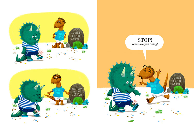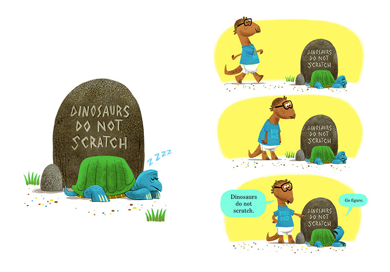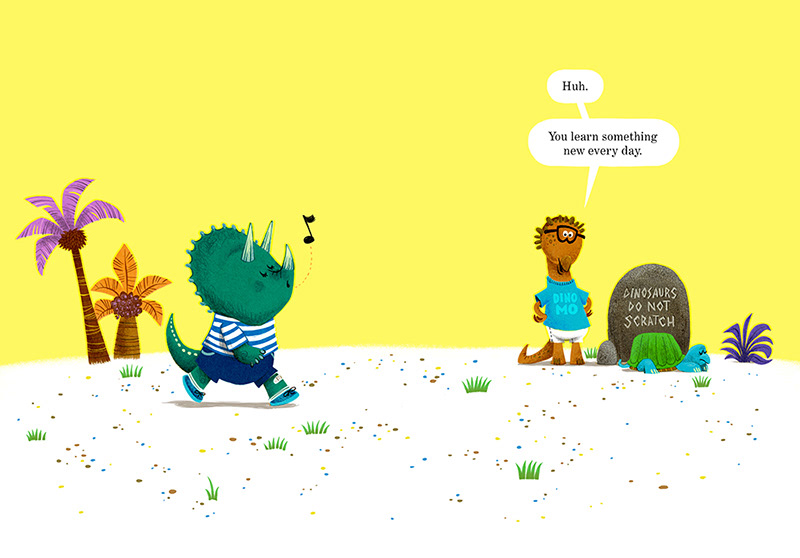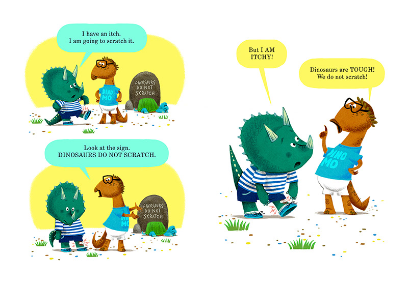 Triceratops has an itch. . . so does Pterodactyl. . . and Brontosaurus. . . and T-Rex! But DINOSAURS DO NOT SCRATCH. There is a rule written in stone. What is an itchy dinosaur to do?!