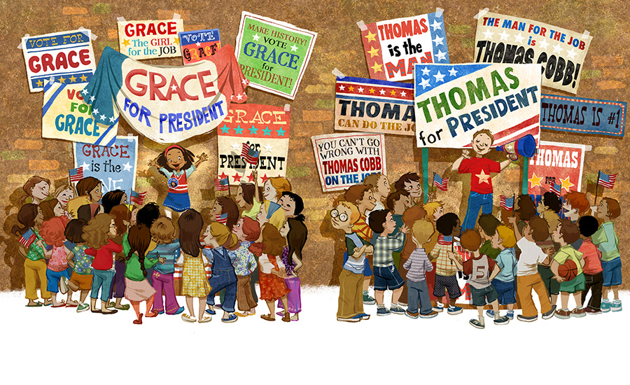 When Grace's teacher reveals that the United States has never had a female president, Grace decides she wants to be the nation's first and jumpstarts her political career by running in her school's mock election! The race is tougher than she expected: her opponent is popular soccer captain Thomas. When Grace comes up with a campaign slogan, Thomas comes up with his own. When Grace makes a list of campaign promises, Thomas makes one, too. She makes posters and buttons...and so does he. This just makes her more determined than ever, so when her opponent claims to be the "best man for the job"—and seems to have captured all the boys' votes—Grace decides the only thing to do is prove that she's the best person for the job!